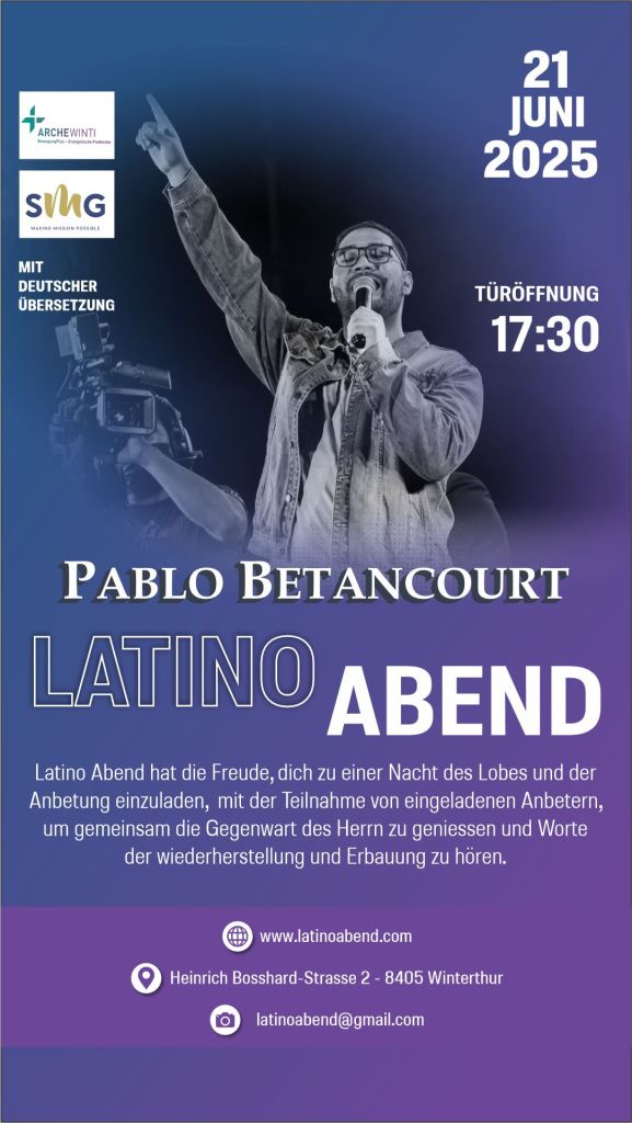 Willkommen auf unserer Latino-Abend-Plattform, einem Raum für die Latino-Gemeinschaft und für alle, die, ohne Latinos zu sein, ihren Glauben an Christus gemeinsam mit uns in der Schweiz wachsen, teilen und stärken wollen.